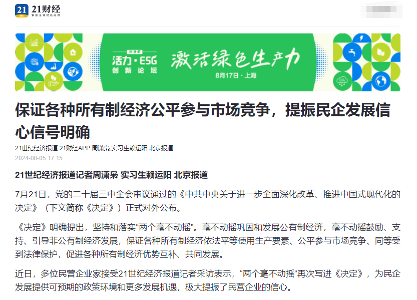 蔣承志對(duì)記者表示,改革開(kāi)放四十多年來(lái),民營(yíng)企業(yè)發(fā)展取得很多成績(jī),但也存在產(chǎn)業(yè)結(jié)構(gòu)有待優(yōu)化、技術(shù)積累不足、關(guān)鍵技術(shù)存在“卡脖子”等問(wèn)題;另外,民營(yíng)企業(yè)在獲取金融資源、人才資源等方面,還存在一些門(mén)檻。黨的二十屆三中全會(huì)在關(guān)鍵時(shí)期給了市場(chǎng)一個(gè)非常確定的信號(hào),明確要構(gòu)建全國(guó)統(tǒng)一大市場(chǎng),要對(duì)各種所有制經(jīng)濟(jì)一視同仁、平等使用各種生產(chǎn)要素、營(yíng)造公開(kāi)公平公正的競(jìng)爭(zhēng)環(huán)境,民營(yíng)企業(yè)受到很大的鼓舞。